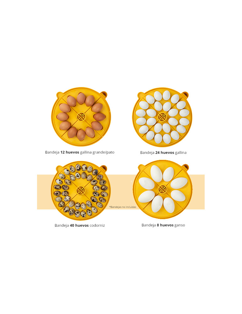 Las bandejas de incubación están dividas en cuatro cuadrantes. Estos cuadrantes se pueden combinar para así poder incubar distintas especies (tamaño de huevo) al mismo tiempo. La incubadora incluye una bandeja para incubación de huevos de gallina con capacidad para 24 huevos y una bandeja para incubación de huevos de gallina grandes o huevos de pato con capacidad para 12 huevos. Opcionalmente podemos adquirir una bandeja específica para de codorniz (40 huevos de capacidad) y de ganso (8 huevos de capacidad).