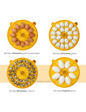 - Volteo: automático, los huevos giran sobre una bandeja circular. Incluye dos bandejas para 24 huevos de gallina o 12 de pato y opcionalmente se pueden adquirir otras dos bandejas, todas ellas divididas en cuartos para poder incubar diferentes especies a la vez. Podemos programar el intervalo y ángulo de volteo y la cuenta atrás para la eclosión y parada del volteo.