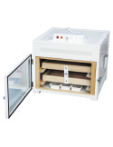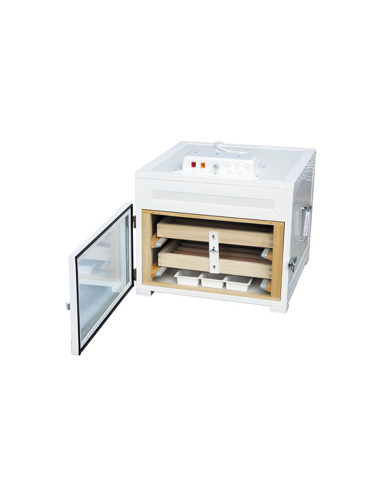 Mueble de madera especial, recubierto de PVC. Absolutamente higiénica y fácil de limpiar. Además de ser ideal para aves de corral es excelente para aves acuáticas. Incluye sistema de control completamente electrónico, disponible con volteo de huevos semiautomático o completamente automático, cristal con aislamiento especial en puerta, iluminación interior, termómetro de precisión y bandejas de madera a su elección. Dimensiones: 49x48x43cm