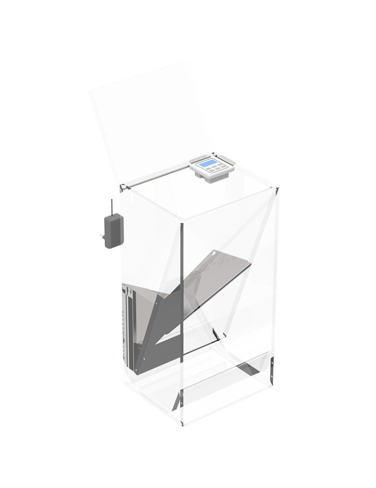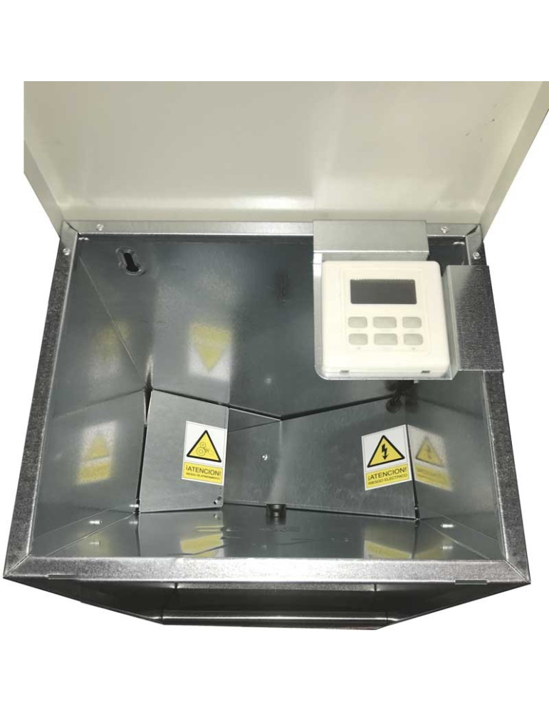Comedero automático para dosificación de pienso para perros con capacidad de 50 litros elaborado en chapa galvanizada de alta calidad y que permite programar hasta 20 dosis diarias.