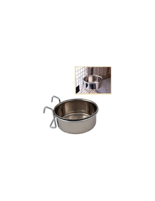 Comedero en acero inoxidable que incluye una brida y una palomilla metálica para su instalación en panel rígido o de malla adaptable para cualquier jaula. Plato extraíble para facilitar el relleno del pienso y con el borde redondeado para evitar cortes en las patas o en la boca del animal.