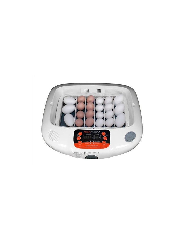 Incubadora totalmente automática para 20 huevos de gallina, 12 huevos de pato, 6 huevos de oca, 30 huevos de perdiz o 40 huevos de codorniz, válida también para otras especies.