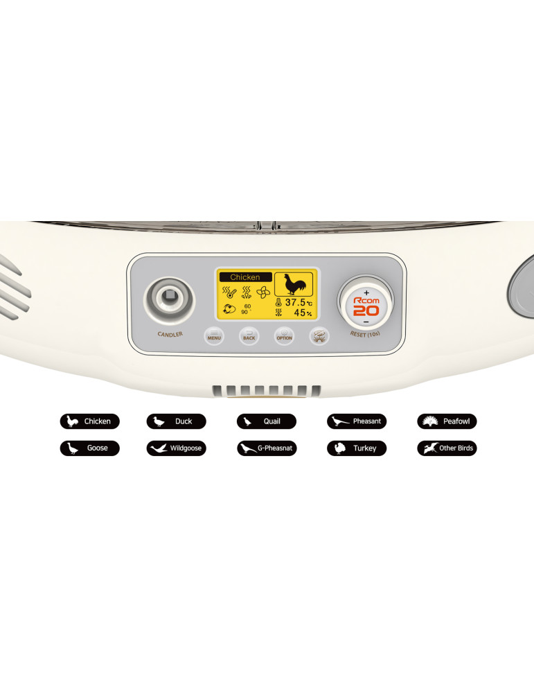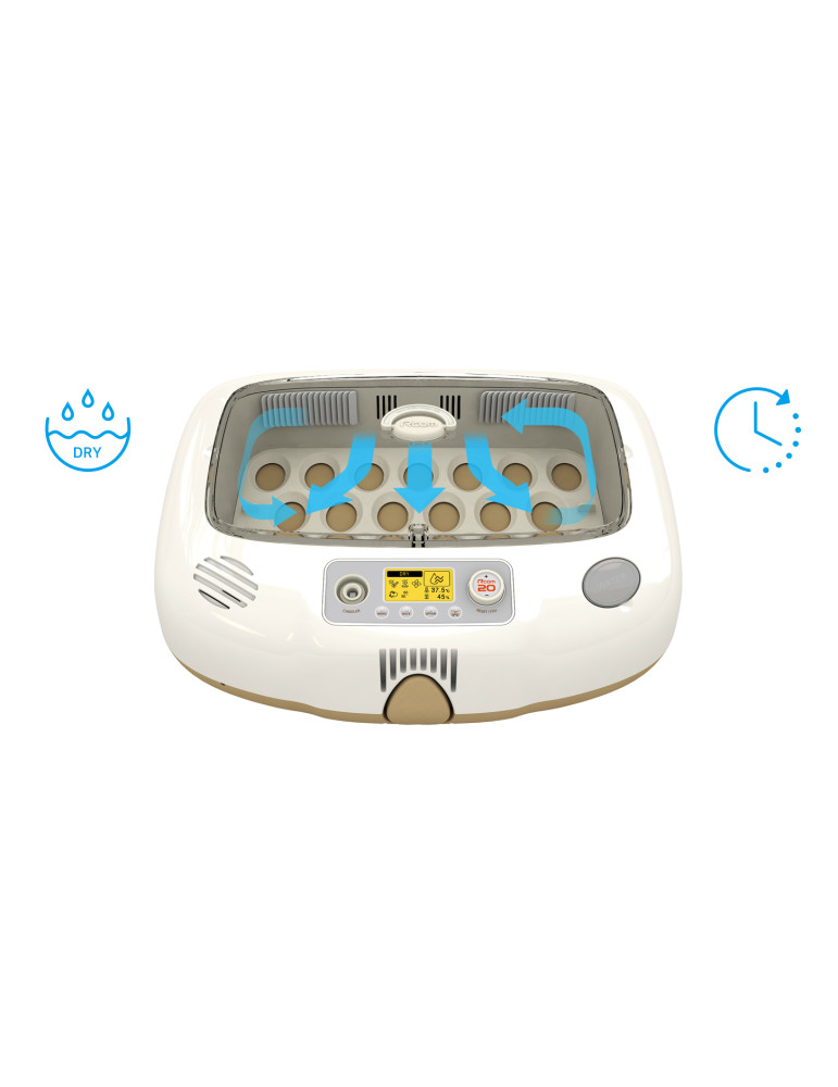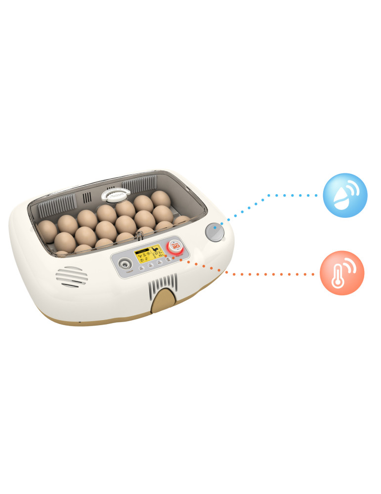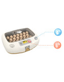 Incubadora totalmente automática para 20 huevos de gallina, 12 huevos de pato, 6 huevos de oca, 30 huevos de perdiz o 40 huevos de codorniz, válida también para otras especies.