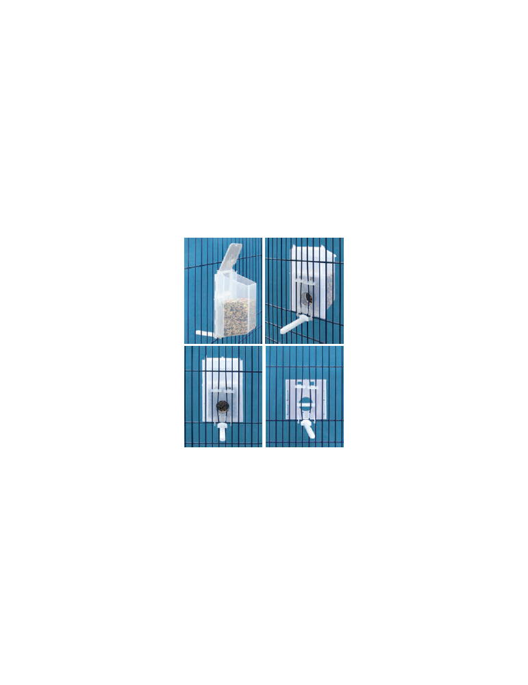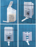 - Incluye un acople universal para cualquier tipo de jaula con dos ganchos de sujeción y un gancho adicional para bloquear el agujero de la comida cuando el deposito va a ser llenado
